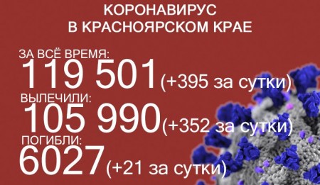 По данным на 9 октября, в Красноярском крае 119 501 случай заражения коронавирусом. За последние сутки выявили 395 новых случаев. За всё время выздоровело 105 990 человек, в том числе 352 за последние сутки. Количество погибших достигло 6027. Скончался ещё 21 пациент с COVID-19.