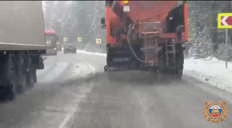 На трассе работают дорожные машины, которые ведут очистку проезжей части и посыпку инертными материалами, чтобы не допустить образования гололёда и наката.