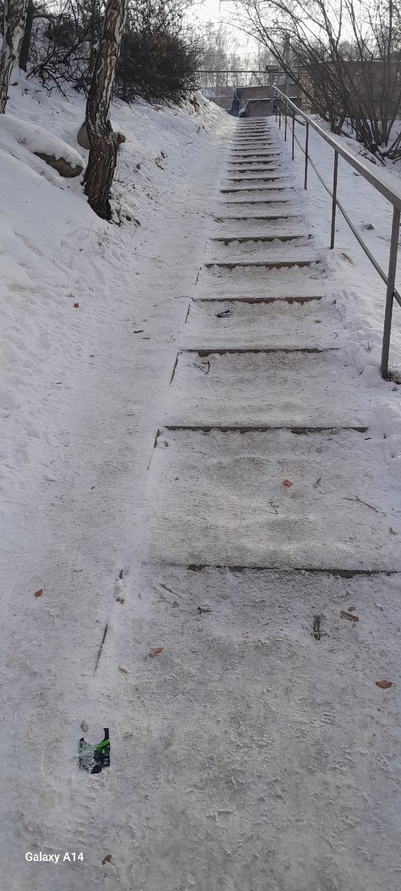 «Администрация, подскажите, пожалуйста, кто будет отвечать, если кто-то сломает тут часть тела? Улица Карла Либкнехта. Пешеходный ведет к улице Горной. Скользко, идти по нему невозможно. Примите меры».