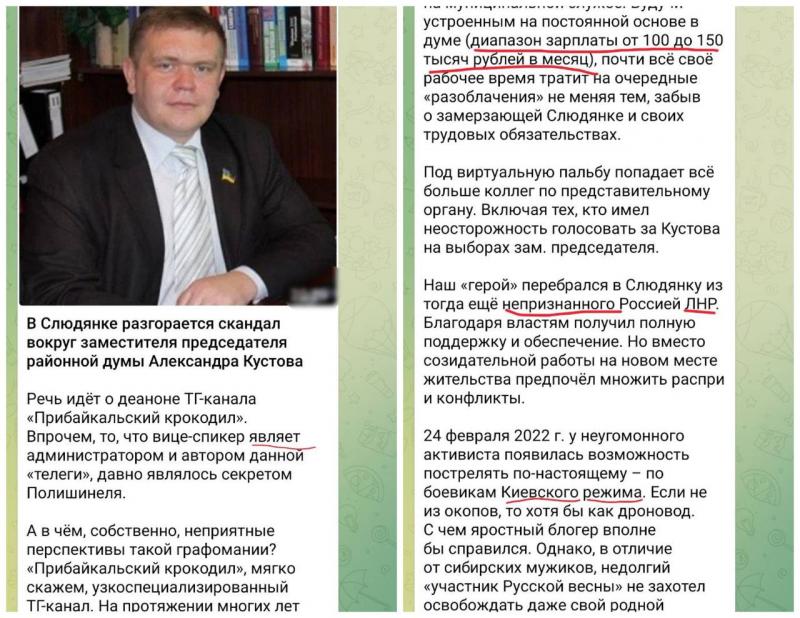 После семи лет откровенной деградации района под руководством такой вот деструктивной гоп-компашки система наконец дала сбой. В 2024 году районная дума была избрана с большинством, открыто противостоящим мэру. Пожалуй, главной фигурой сопротивления стал вице-спикер Александр Кустов – педагог и историк, чей авторитет построен на реальной общественной работе, а не на лояльности провластной шульцевской хунте. В ответ мэр буквально развязал против депутата медийную войну на уничтожение, используя сеть анонимных телеграм-каналов.