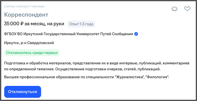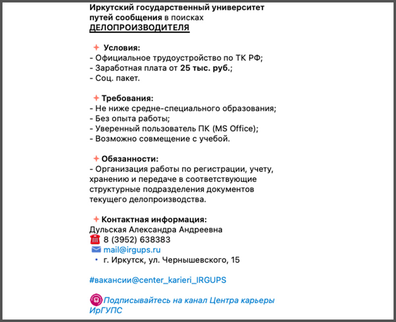 Вот ИрГУПС разыскивает делопроизводителя за 25 тысяч рублей:
