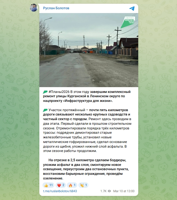 Мэр Иркутска Руслан Болотов вновь вышел к жителям через свой телеграм-канал с рассказом о дорожных планах. На этот раз речь идёт о ремонте улицы Курганской в Ленинском округе. По словам градоначальника, в 2026 году работы должны завершить. Проект реализуется в рамках национального проекта «Инфраструктура для жизни», а сама дорога, как отмечается, имеет важное значение: почти пять километров связывают садоводства и частный сектор с городом.