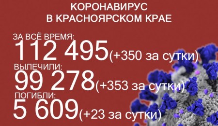 По данным на 18 сентября, в Красноярском крае 112 495 случаев заражения коронавирусом. За последние сутки выявили 350 заболевших. За всё время выздоровело 99 278 человек, в том числе 353 за последние сутки. Количество погибших достигло 5609, скончалось ещё 23 заражённых COVID-19.