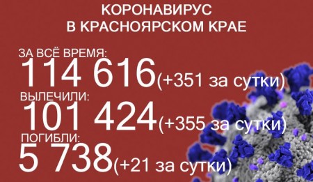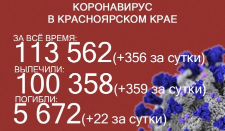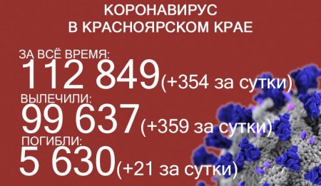 12 сентября число ковидных смертей в Красноярском крае достигло 5630, за последние сутки скончался 21 больной коронавирусом. За сутки выявили ещё 354 заболевших. За всё время пандемии COVID-19 выявили у 112 849 жителей края. Выздоровело 99 637 человек, в том числе 359 за последние сутки.
