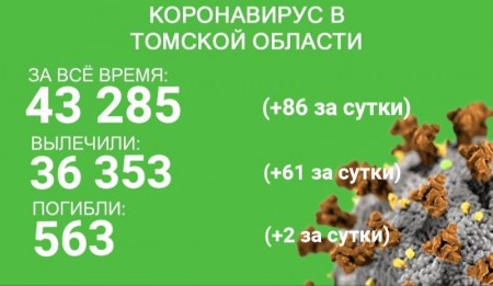 В Томской области за сутки с 25 по 26 сентября коронавирус выявили еще у 86 человек. Всего зарегистрировано 43 285 случаев заболевания. За время эпидемии от коронавируса излечились 36 353 человека, 61 из них выздоровел в минувшие сутки. В регионе от COVID-19 погибли 563 человека.