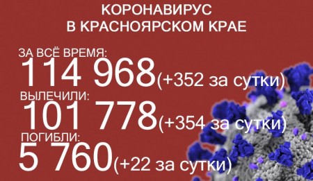 По данным на 27 сентября, в Красноярском крае 114 968 случаев заражения коронавирусом. За последние сутки выявили 352 заболевших. За всё время выздоровело 101 778 человек, в том числе 354 за последние сутки. Количество погибших достигло 5760, скончалось ещё 22 заражённых COVID-19.