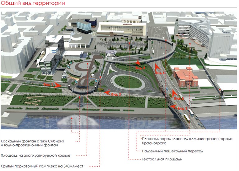 Эскиз проекта-победителя предусматривает подземный переход, который обеспечит связь между площадью и левобережной набережной, а также пешеходный мост, который пересекает нынешнюю парковку. Фонтан «Реки Сибири» оставлен на прежнем месте.