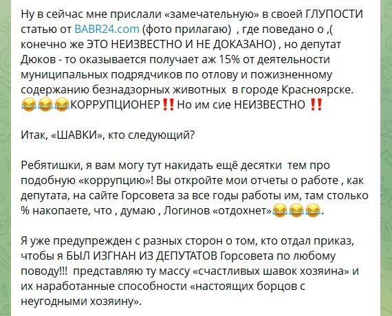 Вячеслав Дюков, депутат городского совета Красноярска, у которого есть избиратели, чьё мнение он должен представлять, – опускается до несправедливых оскорблений и угроз, будто гопник из подворотни.