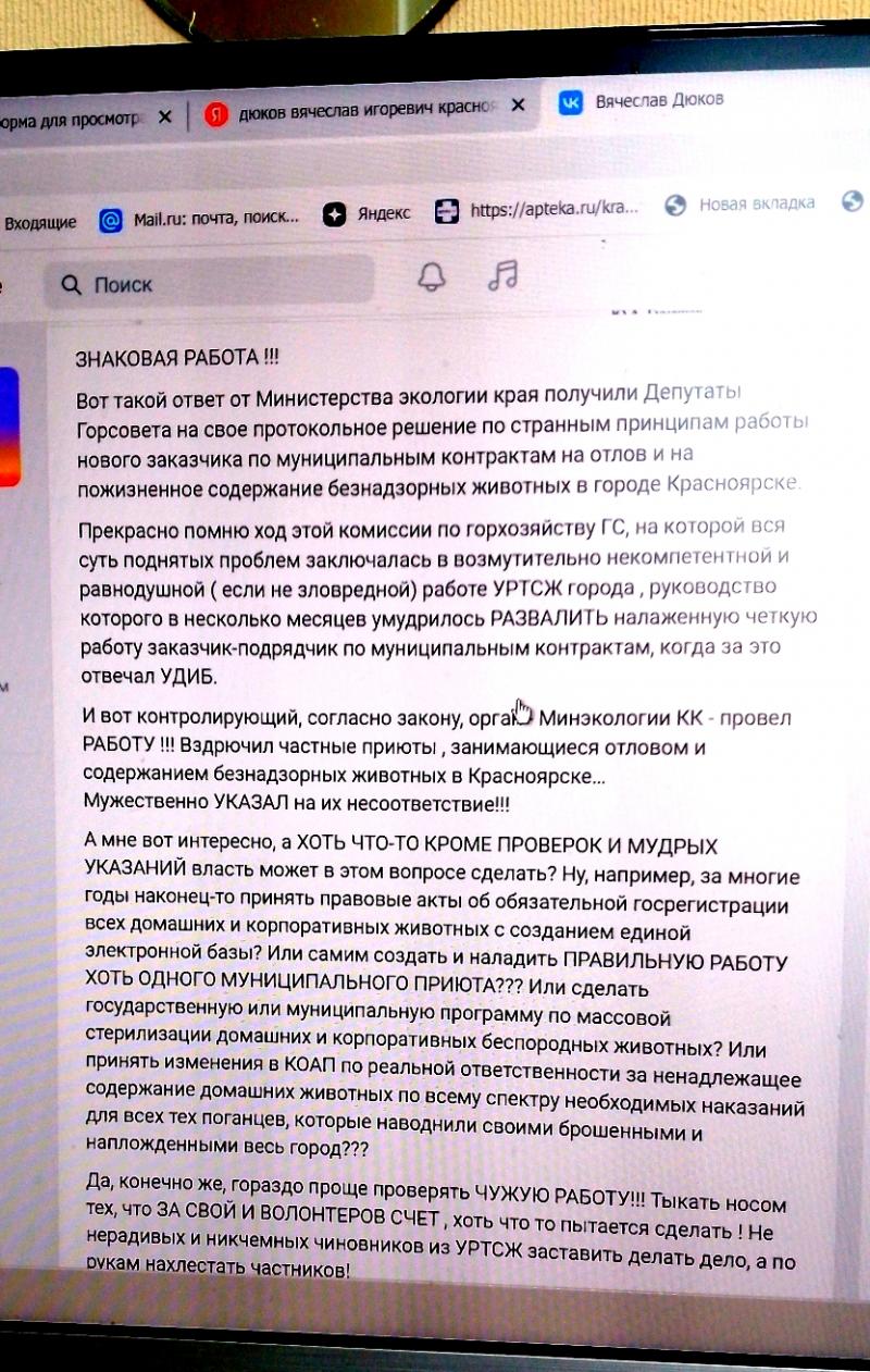 В начале года Дюковым на горсовете был поднят вопрос о «возмутительной и зловредной» работе УРТСЖ (заказчик мэрии по муниципальным контрактам на отловы). После этого комиссия Минэкологии КК посетила частные отловы-приюты Семенова и Поляковой. Инспекционная проверка явно не пришлась по душе депутату Дюкову, и он выложил на свою страницу в Контакте истеричный пост:
