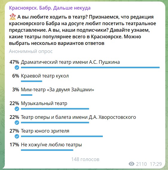 Настало время подвести итоги опроса и викторины, которые касались театральной тематики. Бабр решил поинтересоваться у подписчиков, какие театры они предпочитают посещать и какой театр первым появился в Красноярске и считается старейшим в Сибири? Удивительным образом правильный ответ викторины совпал с выбором театра нашими подписчиками.