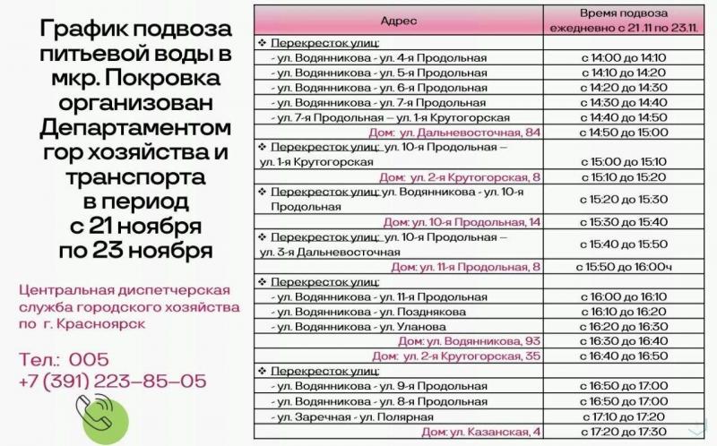Жителям красноярской Покровки придется столкнуться с коммунальными неудобствами: часть домов отключат от холодного водоснабжения на трое суток. Воды не будет с 10:00 21 ноября. Вернуть ее обещают к 10:00 24 ноября.