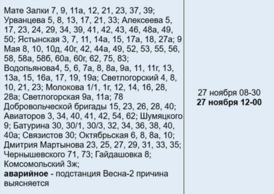 Как сообщает служба 005, люди остались без света из-за аварии на подстанции «Весна-2», которая произошла около 08:30. В зону отключения попали дома на 19 улицах, среди которых улицы Алексеева, Водопьянова, 9 Мая, Молокова, Авиаторов и другие. Также света нет в переулках Светлогорский и Комсомольский.