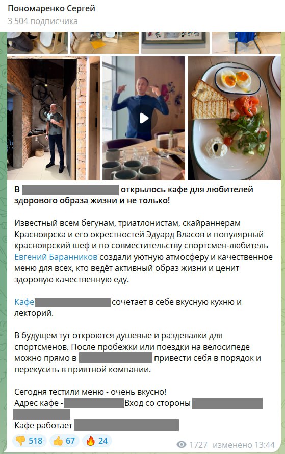 Даже не знаю, что в этой публикации в канале Пономаренко более значимо: то, что его друг Власов, с которым он гуляет по горам в компании заместителя краевого министра спорта Пнева, открыл кафешку в учреждении, находящемся в краевой собственности, или то, что Пономаренко в своем канале публикует информацию, которая явно попадает под категорию рекламы и нуждается в специальной маркировке.