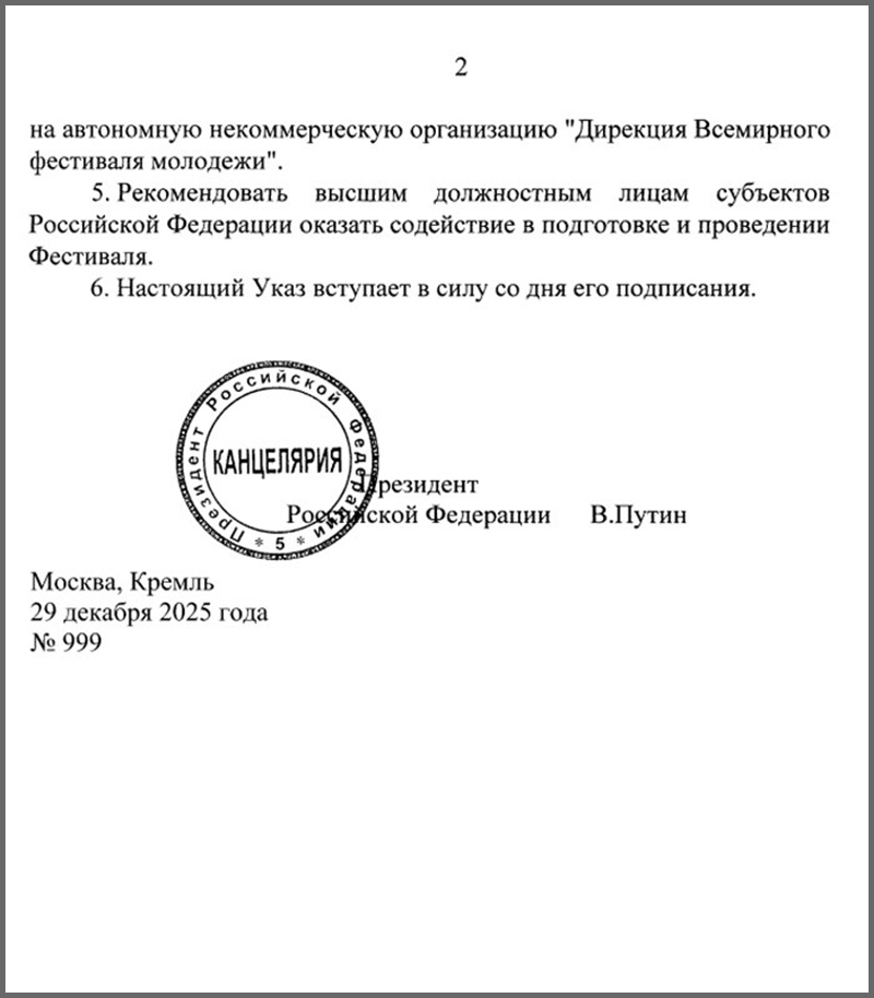 Президент России Владимир Путин подписал указ о проведении Международного фестиваля молодежи в сентябре 2026 года в Екатеринбурге. Документ опубликован на официальном портале правовых актов.