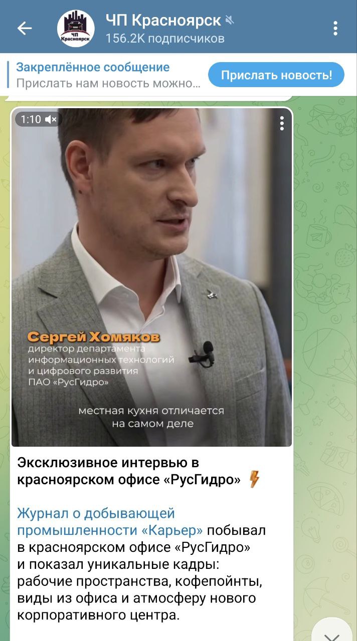 Прошлым летом компания «РусГидро» закончила свой длительный, дорогостоящий и скандальный переезд. И вот, спустя несколько месяцев, видимо, после адаптации московских сотрудников в Красноярске, компания решила выйти из тени и представила красноярской публике весьма странное интервью. Информацию о котором, кстати, разместили в некоторых СМИ и телеграм-каналах в качестве рекламы.