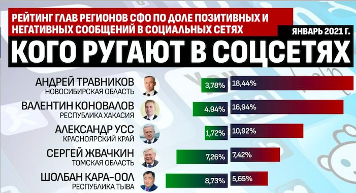 В январе Центр политической конъюнктуры провёл мониторинг социальных сетей на предмет числа негативных упоминаний глав регионов СФО. И составил рейтинг губернаторов, которых много ругают. Исследование получило название «Губернаторы — герои соцсетей». Ну, в данном случае скорее антигерои.