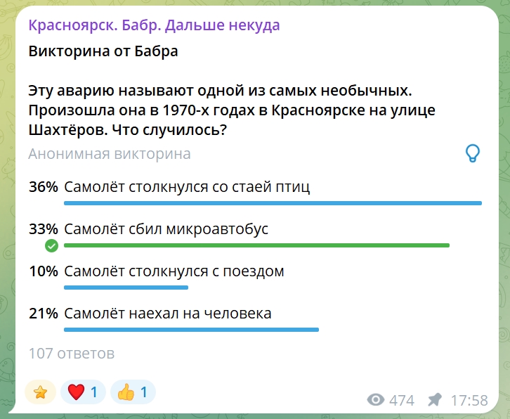 Пришло время подвести итоги викторины, которую в прошлые выходные Бабр проводил в своём телеграм-канале Красноярск. Бабр. Дальше некуда (@kras_24). Какую же аварию называют одной из самых необычных для Красноярска? Правильный вариант выбрали 33% участников викторины. И нет, это было не столкновение самолёта со стаей птиц.