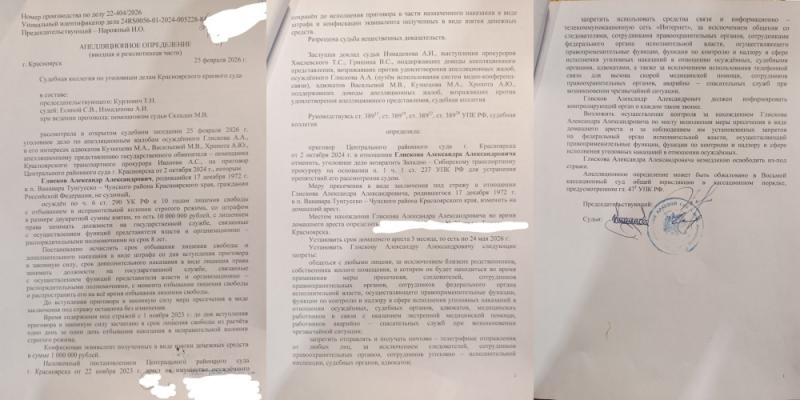В итоге Красноярский краевой суд отменил приговор Центрального суда, вернул материалы дела прокурору, чтобы он устранил препятствия для дальнейшего рассмотрения. Глискова отправили под домашний арест до 24 мая 2026 года.