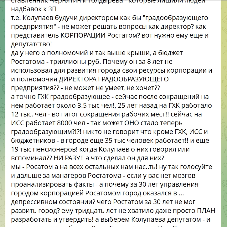 По всей видимости, в ответ на такой пассаж Алексей Кулеш достал из рукава джокер и опубликовал в своём телеграм-канале комментарий размером с простыню. По словам Кулеша, этот комментарий он нашёл под публикацией канала, который администрирует предвыборный штаб «Росатома». Сейчас этого комментария уже нет – его удалили.