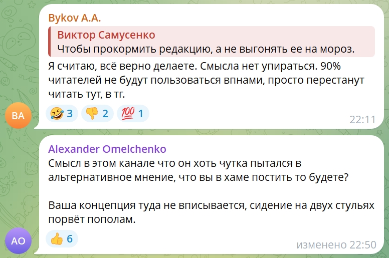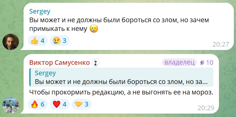 Например, наибольшее удивление вызвали каналы «Борус» и «Борус. Люди», создатель и редактор которых – красноярский журналист Виктор Самусенко. Он объяснил это боязнью рекламодателей размещать рекламу в Телеграме. Не все подписчики восприняли эту новость положительно.