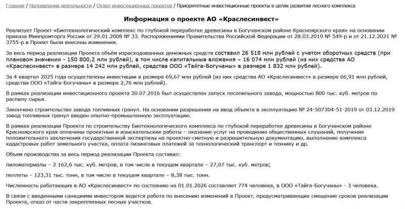 Начался проект в 2008 году и должен был воплотиться в 2013-м, но его постоянно продляют и продляют. Сейчас проект продлён до 2028 года. За прошедшие 17 лет «Краслесинвест» сделал проектно-сметную документацию будущего «биотехнологического комплекса» и получил положительное заключение Госэкспертизы. То есть сама стройка даже не начата. И это за 17 лет.