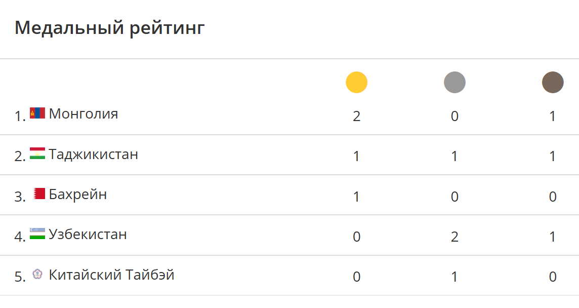 После первого дня Монголия опережает конкурентов в командном зачете. Таджикистан идет вторым, Бахрейн на третьем месте. Турнир только начался, но старт показал, что сборная Монголии, которая выступает в экспериментальном составе, способна бороться за самые высокие позиции.