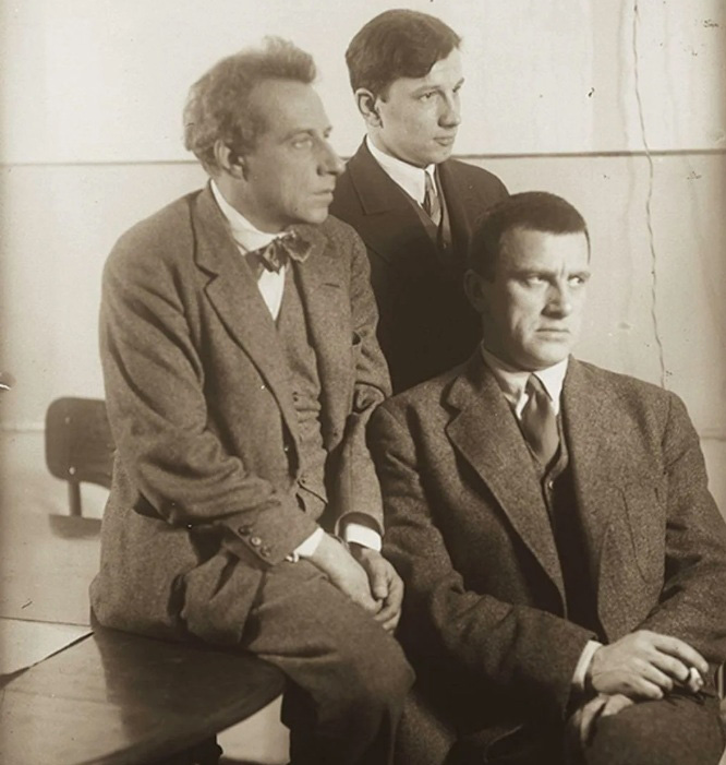 Всеволод Мейерхольд, Николай Эрдман и Владимир Маяковский в Театре имени Мейерхольда, 1928 год