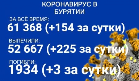 По данным на 20 октября, еще 154 человека в Бурятии заболели COVID-19. Также за сутки 225 пациентов выздоровели, трое скончались. Об этом сообщает пресс-служба регионального Роспотребнадзора. В настоящее время лечение в стационарах проходят 803 человека с коронавирусом и подозрением на него.