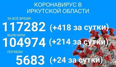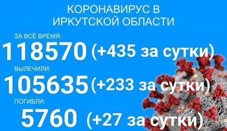 По данным оперштаба Иркутской области на 23 октября, в регионе официально зарегистрировано 118570 подтверждённых тестами ПЦР случаев заражения коронавирусом. Прирост за сутки составил 435 новых случаев. 4363 человека лечится в стационарах, их число за сутки выросло на 94 человека.