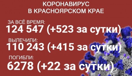 У 523 человек в Красноярском крае выявили COVID-19 за минувшие сутки. Темп прироста составляет 0,4%. Также за это время полностью излечились 415 пациентов, еще 22 скончались. На 20 октября в регионе зарегистрировали в общей сложности 124 547 больных коронавирусной инфекцией.