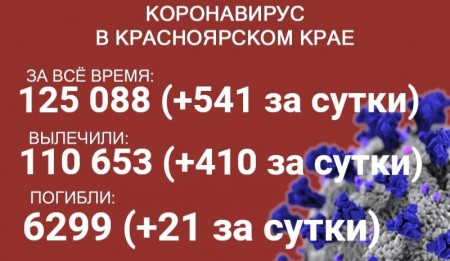 У 541 человек в Красноярском крае выявили COVID-19 за минувшие сутки. Темп прироста составляет 0,4%. Также за это время полностью излечились 410 пациентов, еще 21 скончался. На 20 октября в регионе зарегистрировали в общей сложности 125 088 больных коронавирусной инфекцией.