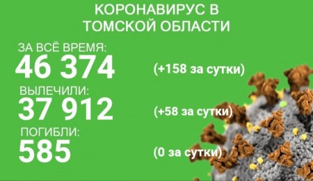 По состоянию на 23 октября в Томской области зарегистрировано 46 374 случая новой коронавирусной инфекции. За минувшие сутки заболевание выявлено у 158 человек. С начала эпидемии излечились 37 912 человек. 58 пациентов выздоровели за сутки с 22 по 23 октября.
