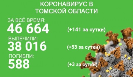 По состоянию на 25 октября в Томской области зарегистрировано 46 664 случая коронавируса. В минувшие сутки заболевание выявили у 141 человека. С начала эпидемии излечились 38 016 человек. 53 пациента выздоровели в последние сутки.