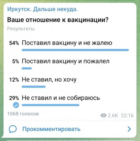 Результаты опроса Бабра показали, что большая часть подписчиков телеграм-каналов Иркутск. Дальше некуда и Бабр. Форум поставили вакцину от COVID-19 и ни о чем не жалеют. Почти треть опрошенных – 29% – не ставили вакцину и не собираются этого делать, ещё 5% поставили и теперь жалеют.