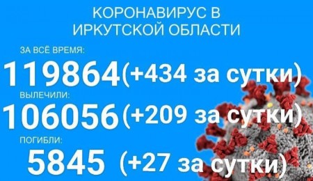 По данным оперштаба Иркутской области на 26 октября, в регионе официально зарегистрировано 119864 подтверждённых тестами ПЦР случая заболевания коронавирусом. Суточный прирост составил 434 новых случая. 4621 человек находится в ковидных стационарах.