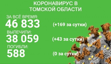В Томской области за сутки с 25 по 26 октября зарегистрировано 169 случаев новой коронавирусной инфекции. Всего в регионе выявлено 46 833 случая заболевания. С начала эпидемии излечились 38 059 человек. За минувшие сутки выздоровели 43 пациента.