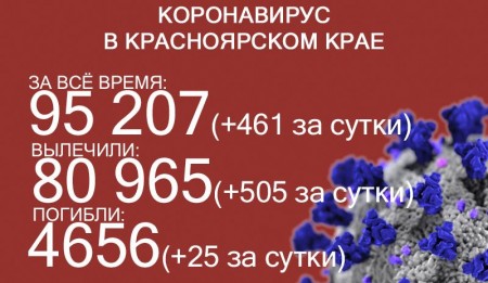 По данным на 9 августа, в Красноярском крае 95 207 случаев заражения коронавирусом. За последние сутки выявили 461 новый случай. За всё время выздоровело 80 965 человек, в том числе 505 за последние сутки. Количество погибших достигло 4656, скончалось ещё 25 заражённых COVID-19.
