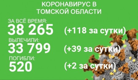 В Томской области коронавирусом заболели 38 265 человек. 118 случаев заболевания из общего числа зарегистрировано за сутки с 8 по 9 августа. За все время эпидемии излечились 33 799 пациентов, 39 из них выздоровели в минувшие сутки.