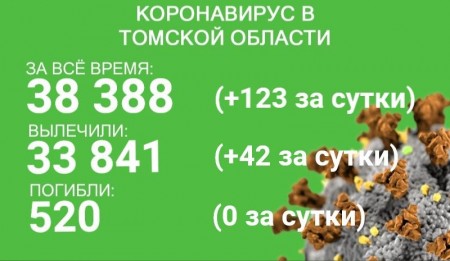 В Томской области коронавирус зарегистрирован у 38 388 человек. У 123 из них заболевание выявили в минувшие сутки. С начала эпидемии излечились 33 841 человек. За сутки с 9 по 10 августа выздоровели 42 пациента. В регионе от коронавируса и его последствий погибли 520 человек.