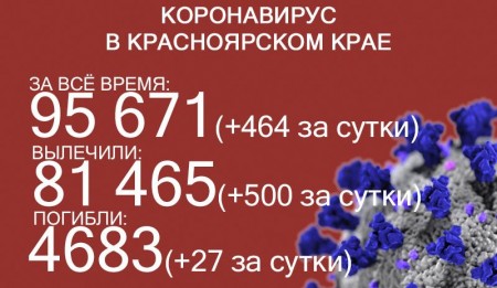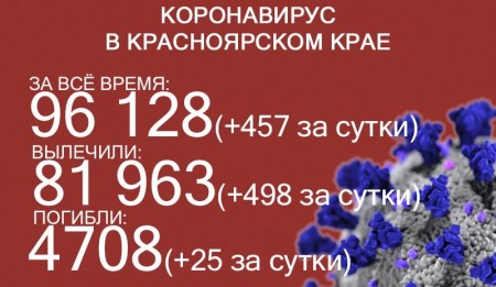 По данным на 7 августа, в Красноярском крае 94 284 случая заражения коронавирусом. За последние сутки выявили 459 новых случаев. За всё время выздоровел 79 950 человек, в том числе 499 за последние сутки. Количество погибших достигло 4609, скончалось ещё 23 заражённых COVID-19.
