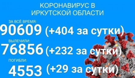 По данным оперштаба Иркутской области на утро 12 августа, в регионе зарегистрировано 90609 официально подтверждённых тестами ПЦР случая заболевания коронавирусом. За сутки выявлено ещё 404 новых случая, в том числе 37 детей до 17 лет и трое вахтовиков.