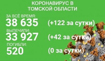 В Томской области за сутки с 11 по 12 августа коронавирус зарегистрирован у 122 человек. За все время выявлено 38 635 случаев заболевания. В минувшие сутки выздоровели 42 пациента. За время эпидемии излечились 33 927 человек. В регионе от коронавируса и его последствий скончались 520 человек.