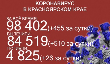 По данным на 16 августа, в Красноярском крае 98 402 случая заражения коронавирусом. За последние сутки выявили 455 заболевших. За всё время выздоровело 84 519 человек, в том числе 510 за последние сутки. Количество погибших достигло 4825, скончалось ещё 26 заражённых COVID-19.