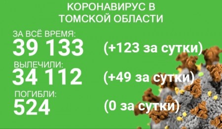 В Томской области по состоянию на 16 августа зарегистрировано 39 133 случая заражения коронавирусом. У 123 человек заболевание зафиксировали в минувшие сутки. За сутки с 15 по 16 августа выздоровели 49 пациентов. С начала эпидемии излечились 34 112 человек.