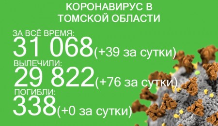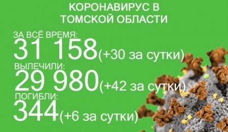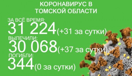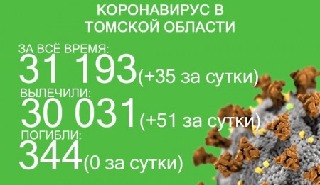 24 марта количество заражений коронавирусом в Томской области достигло 31 193, за последние сутки болезнь выявили ещё у 35 жителей региона. С начала пандемии выздоровел 30 031 человек, с 23 марта из больниц выписали ещё 51 пациента. За всё время скончалось 344 заражённых COVID-19.