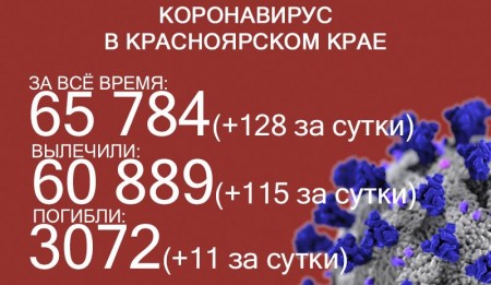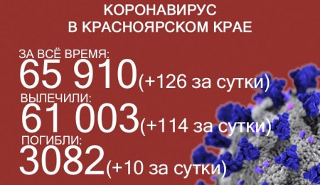 По данным на 24 марта, в Красноярском крае 65 910 случаев заражения коронавирусом, выявили ещё 126 больных. Темп суточного прироста — 0,2%. За всё время выздоровели 61 003 человека, в том числе 114 за последние сутки. Количество погибших достигло 3082, скончалось ещё 10 заражённых COVID-19.