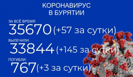 За сутки в регионе коронавирус подтвердился у 57 человек, 145 выздоровели, трое скончались. По данным Роспотребнадзора на утро 24 марта, всего в республике подтверждены 35670 случаев заражения COVID-19. Из них в Улан-Удэ — 18915 случаев, это 54% от общего числа инфицированных.