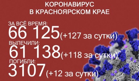 По состоянию на 21 марта в Красноярском крае зафиксировано 65530 случаев заражения коронавирусом. За последние сутки количество заражённых выросло на 127 человек. За последние сутки выписали 117 человек, всего выздоровели 60658 человек. Скончался 3051 человек, 12 из них – за последние сутки.