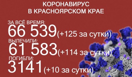 По данным на 29 марта, в Красноярском крае 66 539 случаев заражения коронавирусом. Суточный прирост — 125, темп прироста – 0,2%. За всё время выздоровело 61 583 человека, в том числе 114 за последние сутки. С начала пандемии скончался 3141 заражённый COVID-19, погибло ещё 10 человек.