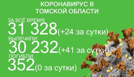 По данным на 29 марта, еще 24 человека в Томской области заболели COVID-19. Также за сутки 41 пациент выздоровел. Летальных исходов зарегистрировано не было. Об этом сообщает региональный оперштаб по коронавирусу.